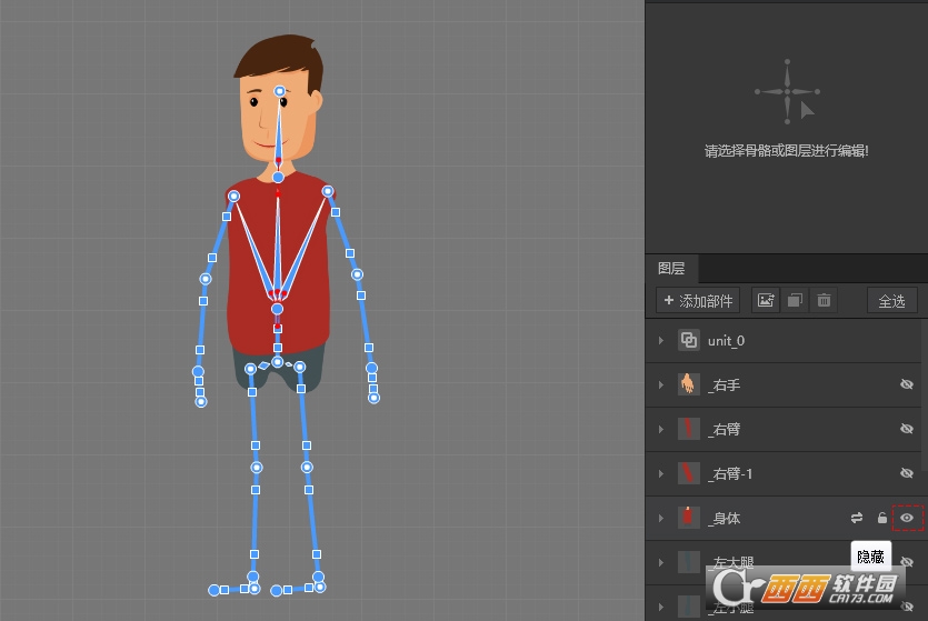 进入添加骨架操作界面,即可开始给角色图片添加骨头。假如是想要实现更顺滑的曲线运动效果,则可以选择添加曲线骨头。