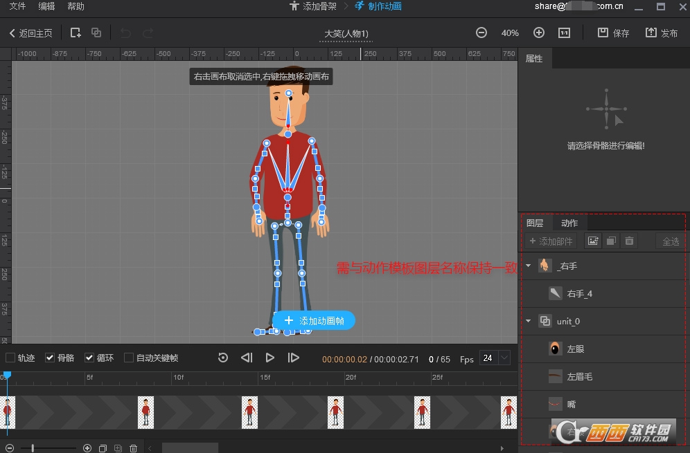 该软件可以多张图片同时编辑,利用骨骼控制多张图片的不同的姿势与动作,做出协调且丰富的角色动画,可随时预览效果。- 下载地址(pc版)