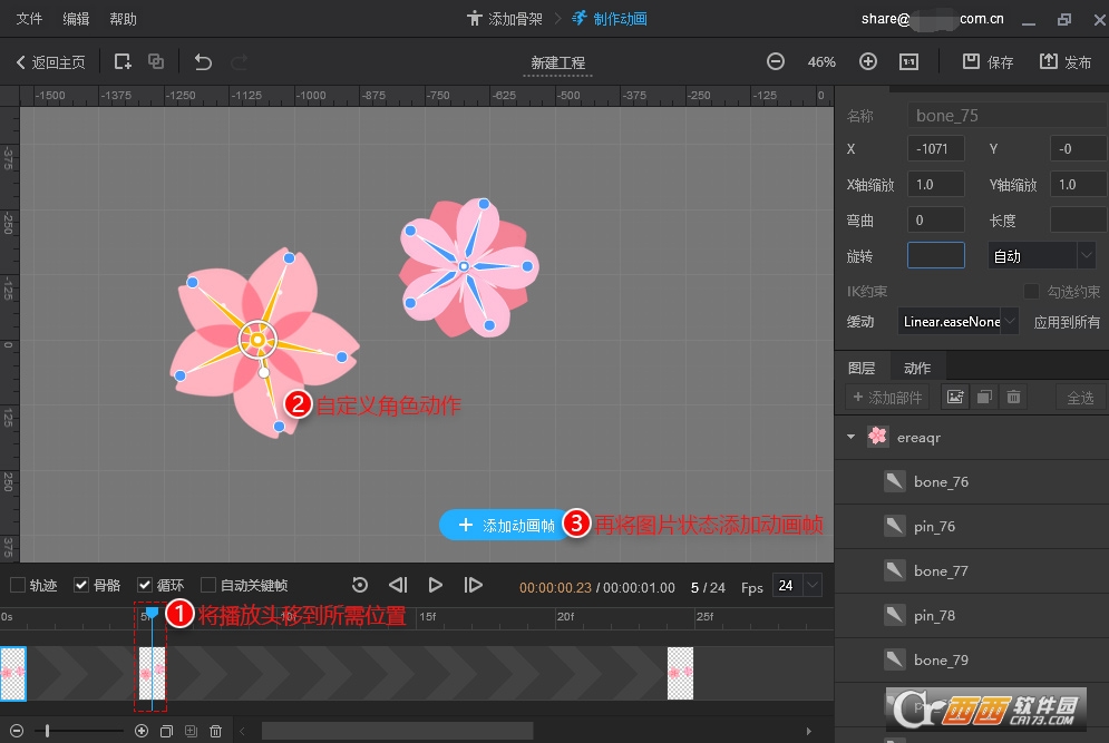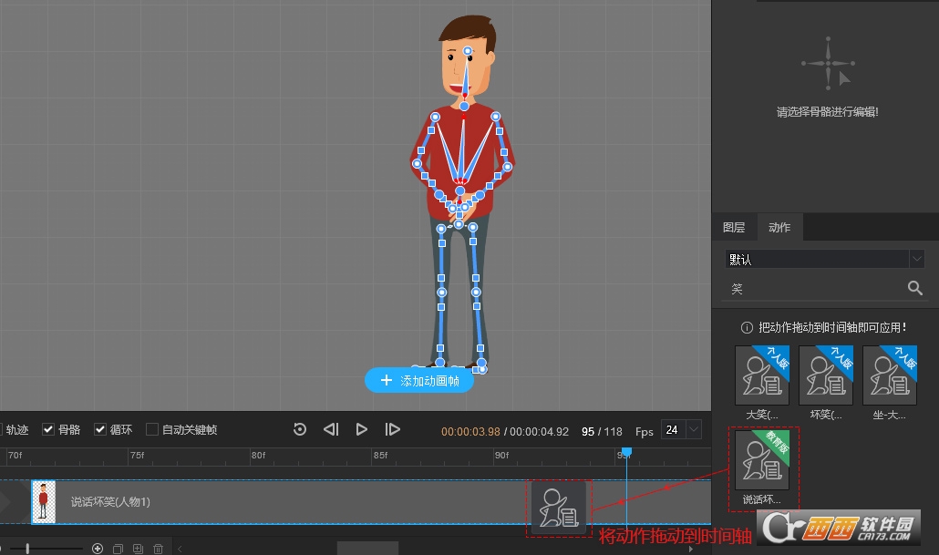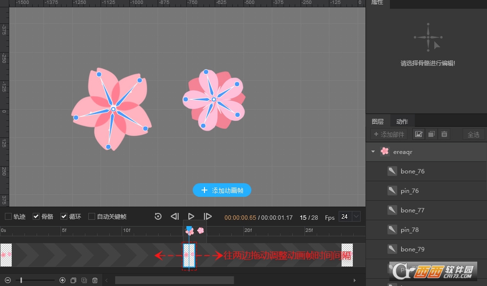 添加完骨头后,即可开始制作动画。拖动时间轴的播放头到所需的动画帧位置,调整角色动作(移动,旋转等),再【添加动画帧】。调整好的动作动画帧即可显示在时间轴中。
