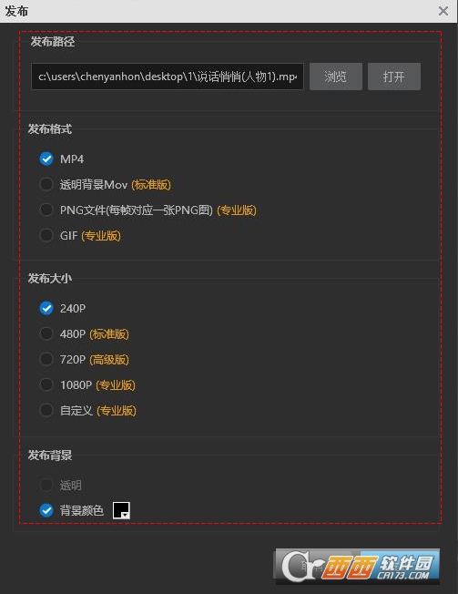 制作动画完成后,就可以准备发布作品。目前万彩骨骼动画大师提供4种发布格式:MP4、透明Mov、PNG文件和GIF。用户根据自身需求来输出相应的格式。