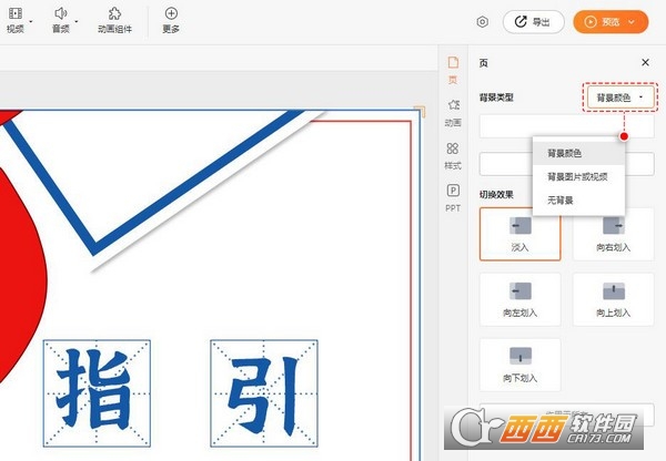 添加新页后,可点击界面右侧【页】选项,为其选择不同的切换效果, 如淡入,从上/下/左/右划入等。