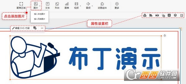 目前布丁演示支持添加图片,文本,形状,图表,视频,音频,动画组件,逻辑组件,公式符号等素材,在属性栏中, 支持自定义元素对象的多种属性。