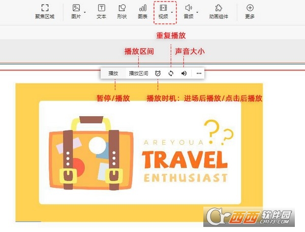 支持添加本地视频/音频/动画组件,或网络视频/音频/动画组件,可设置播放区间,播放时间,是否重复播放,音量大小等。