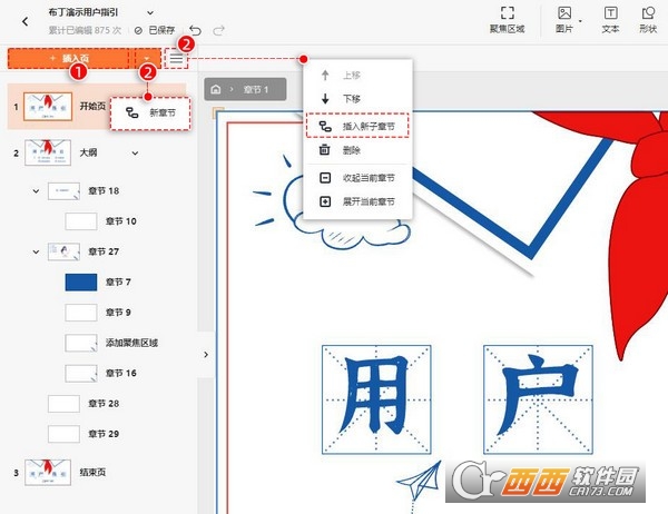 ②: 点击左上角的【+插入页】的下拉箭头--【新章节】,或在【更多】中选择【插入新子章节】,可以添加新子章节。
