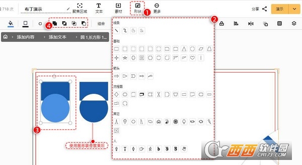 布丁演示支持添加常见的形状。 属性设置除了支持常见的颜色, 组合, 翻转, 透明度等以外,还提供强大的图形联合功能。