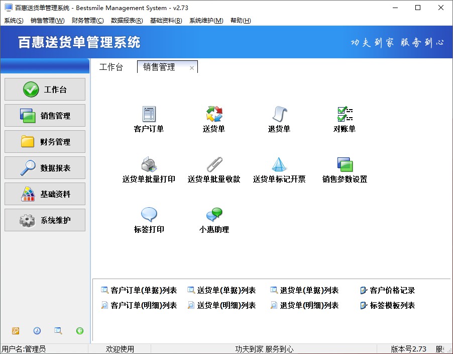 百惠送货单打印软件具备送货单、销售订单、客户对账单、客户欠款管理、资料管理、现金记账等的单据打印和管理功能,支持“即输即打”、批量导入资料等特色功能,功能实用、操作简便、且具有很强的个性化能力,能满足不同用户和不同行业的个性要求,是一款简单好用的免费销售送货单打印软件!