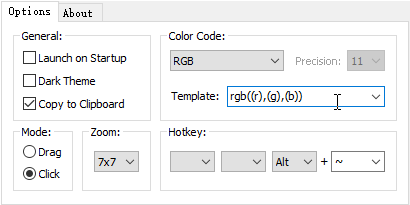 3、Options包含更多选项,比如更改颜色代码的模板,自定义热键,更改缩放区域大小。下图中我们将rgb更改为了 rgb(r,g,b)的 格式。