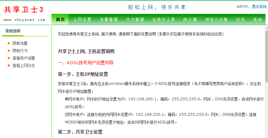 共享卫士目前只支持Windows 2000/Windows XP/Windows 2003等操作系统平台上的ADSL拨号或固定IP接入共享应用,支持单网卡或多网卡共享接入方式。