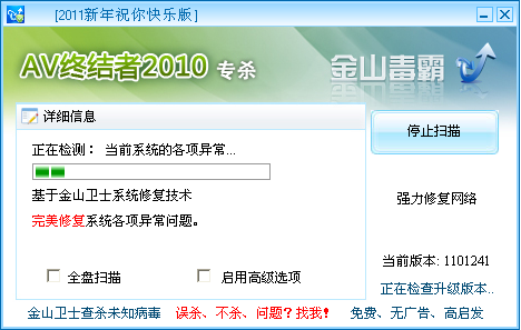 2、快速扫描完毕后av终结者2010专杀会提示激活金山网盾特权,按“是”并成功下载安装网盾,打开网盾后,点击“一键修复”,可彻底清除病毒破坏的系统文件和清除下载的病毒木马。
