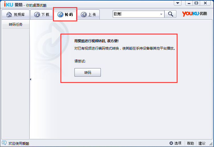 3、点击转码,你可对已有视频进行编码格式转换,使其能在手持设备等其他平台播放