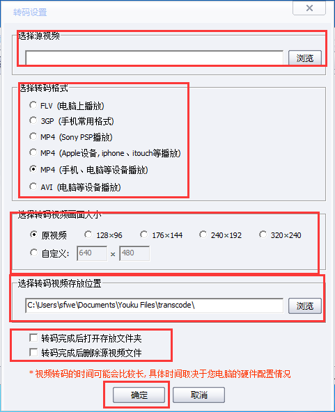 选择转码后是否打开存放文件夹,是否删除源视频文件,最后点击确定