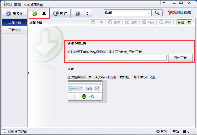2、点击下载,粘贴你想下载的优酷视频所在播放页的地址,即可开始下载