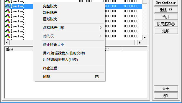 6、点击中间的PID、基址,可以显示脱壳的项目