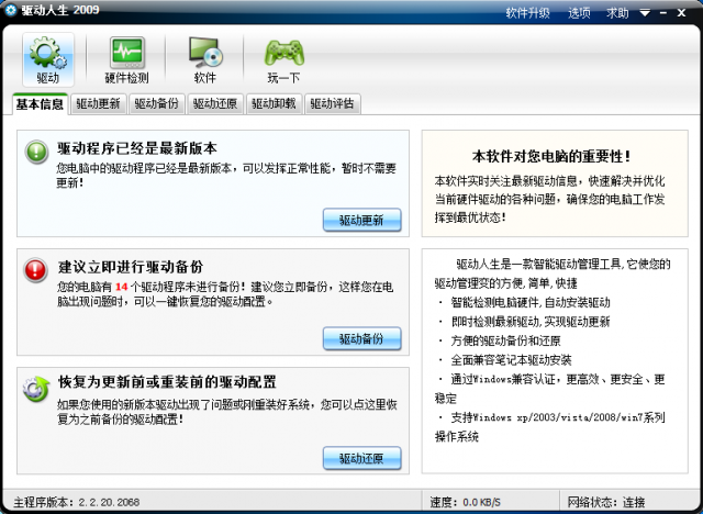 驱动人生2009是一款免费的驱动管理软件,实现智能检测硬件并自动查找安装驱动,为用户提供最新驱动更新,本机驱动备份、还原和卸载等功能。软件界面清晰,操作简单,设置人性化等优点,大大方便广大机友管理自己的电脑的驱动程序。
