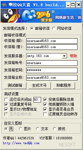 6、在“高级选项”中如果勾选“关闭QQ60秒后”,用户一旦运行大盗生成的木马,QQ将在60秒后自动关闭,当对方再次登陆QQ,其QQ号码和密码会被木马拦截并发送到预先设定的“收信邮箱”中。