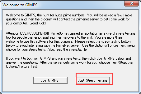 1、在本站下载Prime95,打开安装程序,首次使用时,Prime95中文版软件会弹出选择对话框。在这里选择“Just Stress Testing”,如图所示: