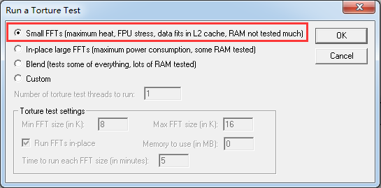 2、接下来在测试选项中,选择第一项,其它设置保持不变。这一项主要是用于对 CPU 的浮点运算测试,另外还会对 CPU 的缓存进行填充测试。选择好以后,点击“OK”按钮,如图所示: