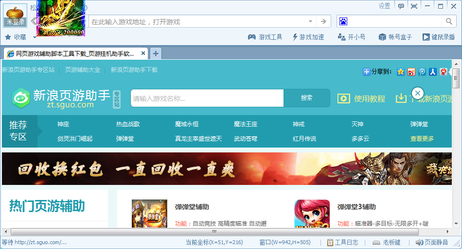 松果游戏浏览器内置了许多丰富的游戏辅助工具,包括花千骨、武神超子龙、天黑请闭眼、山海经之赤影传说等游戏辅助功能哦。有了这个玩游戏从此无需再过多手动操作哦。