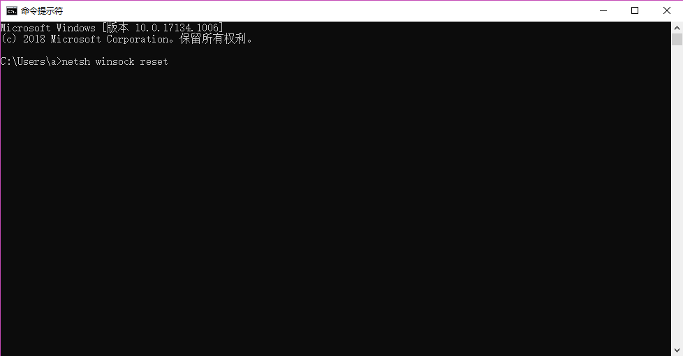 在弹出的框里输入 “netsh winsock reset”,回车确认后重启电脑即可
