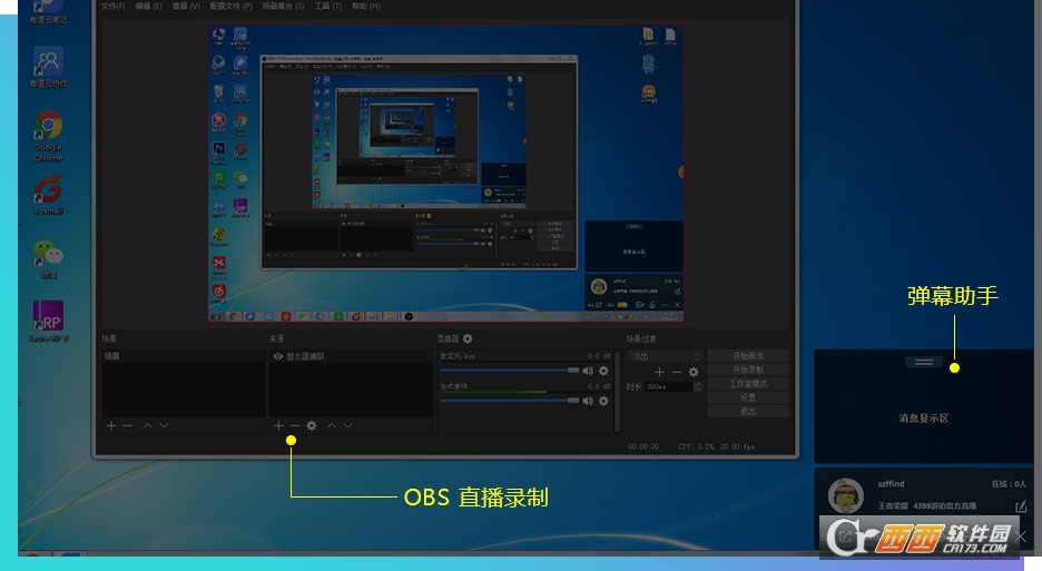 第二步:直播窗口由 [OBS] 与 [弹幕助手] 构成,OBS主要用于直播录制,弹幕助手主要用于与用户进行互动。