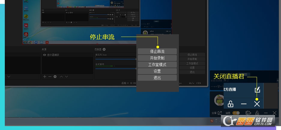 第五步:点击OBS中“停止串流”或关闭直播君来停止直播。