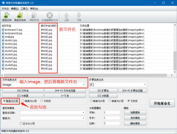 首先在文件名表达式中添加下划线分割,变为“image_图片_”,然后在“文件名表达式”区域中找到“[C]计数器”,点击之后,可以看到文件名表达式变成了“image_图片_[C]”,此时可以看到新文件名变成了“IMAGE_图片_001.jpg”等按顺序递增的形式,如下图所示: