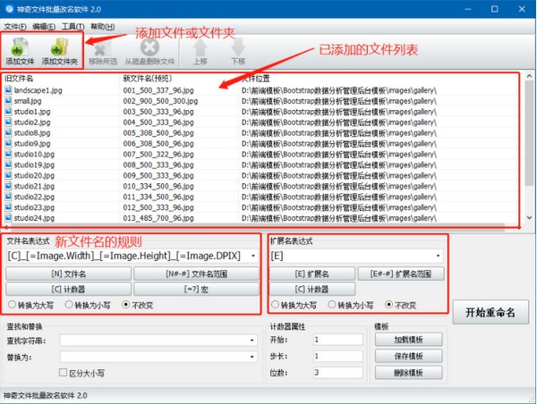。示例为将多个图片文件名转换为类似“IMAGE__图片_001_1920_1080.jpg”格式。其中,“001”代表计数器,“1920”代表图片宽度,“1080”代表图片高度。