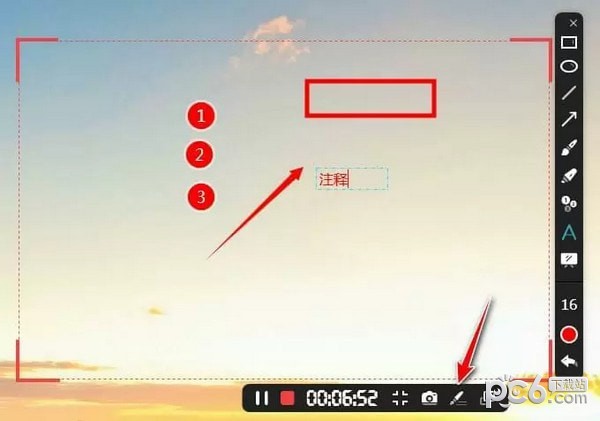 为了让视频更加具有指导性,可以在录制的时候点击工具栏上的笔状“涂鸦”按钮。实时编辑功能包含添加标序、线段、文字、箭头、矩形、椭圆等等。