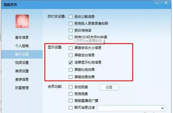 2、如何进行房间显示设置在房间中如果您想屏蔽掉一些信息,可以在我的齐齐中的聊天设置中设置屏蔽项: