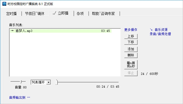 时方校园定时广播系统,此软件可用于学校自动打铃,定时广播课间操、背景音乐。通过电脑软件定时播放音乐,并将电脑音频输出连接至功放机,此方案具有简单灵活、成本较低的优点。
