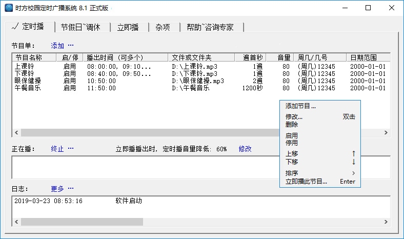 1、简单易用,就是添加一个个的节目: 时间、内容、遍首秒、周几/几号、音量等。
