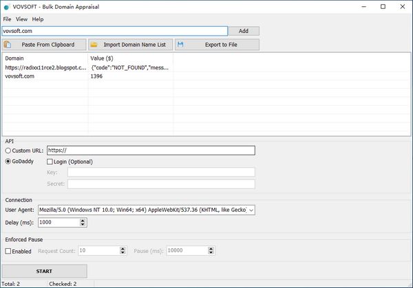 Bulk Domain Appraisal对大的域列表执行多个域评估。填写你的批量域名列表和评估你的所有域名。使用此工具,您可以轻松计算域名值。允许使用剪贴板或txt文件导入域名列表。结果可以导出为TXT或csv文件。默认情况下,评估软件使用的是gody工具。请注意,GoDaddy API每分钟只允许60个请求。