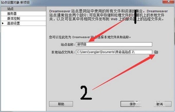 2、然后会弹出一个对话框,我们给这个站点取一个名字,然后下面点击后面的文件夹图标找到项目所在的文件夹。