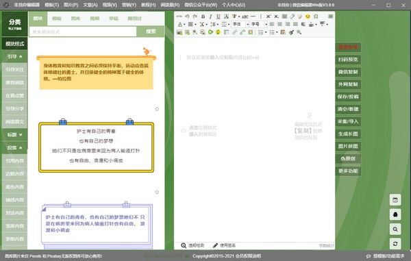 1、电脑安装,无网络也可以使用。2、编辑器包含上千款素材模块(动态图、精美插图、封面图、流行表情图片等等)。
