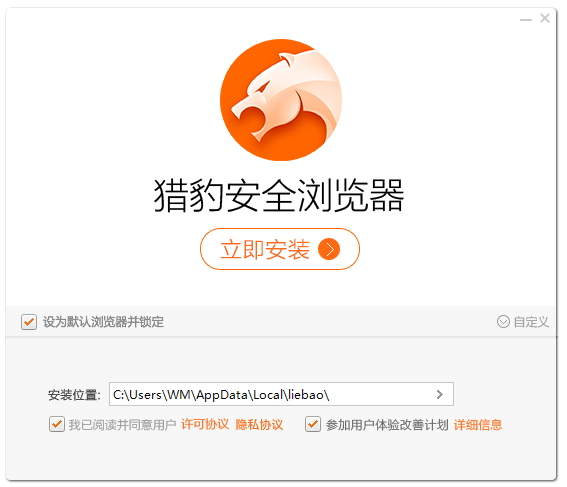 下载猎豹浏览器,解压压缩包,双击.exe文件,弹出界面,立即安装;