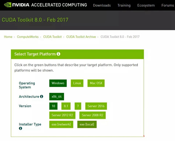 接下来就是和GPU相关的CUDA8了,选择相应的系统版本便可以下载安装。在安装方式这一步建议大家使用本地安装exe[local]的方式,exe[network]的安装方式….可能有点慢。默认情况下CUDA会自动帮你添加到环境变量,如果没有,请手动添加,这一步非常重要。