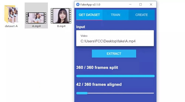 咱们姑且用A和B来区分这两个小姐姐好了,按照FakeApp的提示,将素材路径填入,点击EXTRACT,接下来无需任何操作,等程序跑完就行了。你会看到fake文件夹中多出了一个dataset-A的目录,这便是我们待会儿训练模型时需要的数据集了。A的训练集生成后,重复这一步骤,生成B的训练集。至此,咱们第一步结束了。