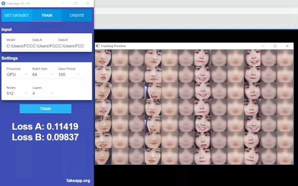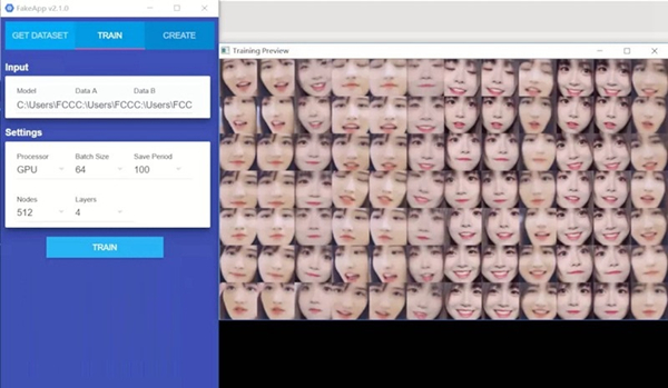 值得一提的是,训练进度会被实时保存下来,也就是说你可以随时暂停训练,在预览窗口中,输入英文小写字母q即可保存退出,下次想要继续训练的话,打开FakeApp再点击TRAIN即可。