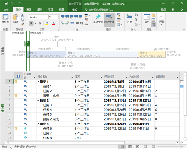 你会注意到 Project 2016中的功能区上的一个文本框,其中显示“告诉我您想要做什么”。 这是一个文本字段,你可以在其中输入与接下来要执行的操作相关的字词和短语,快速访问要使用的功能或要执行的操作。 你还可以选择获取与要查找的内容相关的帮助。
