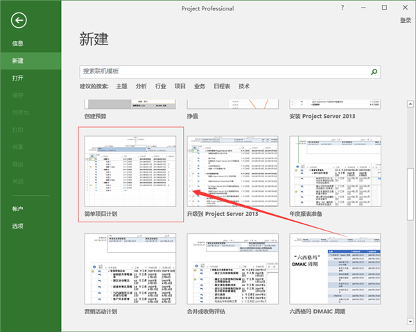 首先打开Project 2016,然后选择新建--所需的模板项目文档(以简单项目计划为例,如图一)