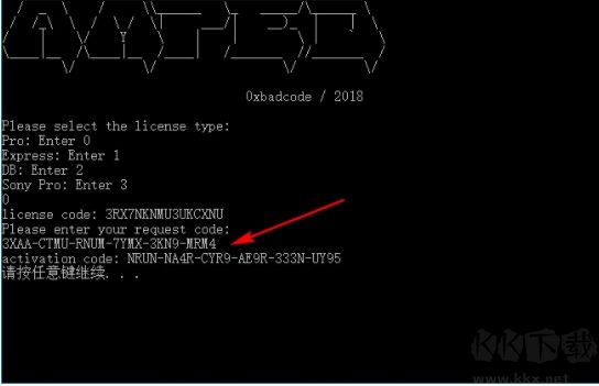 3、打开注册机,输入序号(出现的三个版本,由于小编选择的是Pro版,所以这里输入0)回车之后就可以自动计算出许可证,复制3RX7NKNMU3UKCXNU到软件激活界面