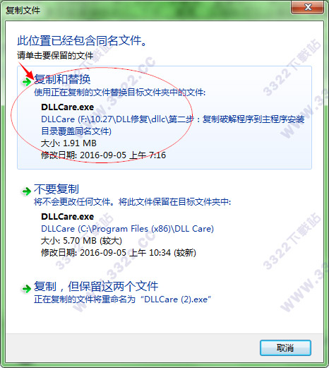 1.安装好后,先不要打开软件,回到数据包中将破解文件“DLLCare.exe”复制到软件的安装目录中“C:\Program Files (x86)\DLL Care”