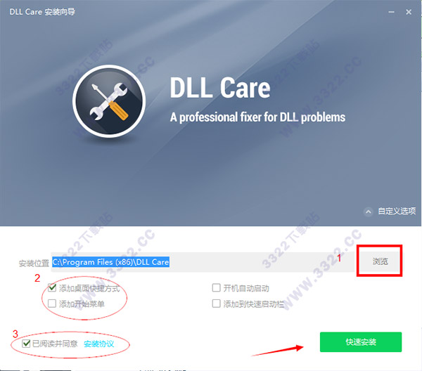 1.下载好数据包后,直接解压用鼠标双击“DLLCare_Setup.exe”打开进入安装向导,点击“浏览”可随意更改安装目录,默认路径为“C:\Program Files (x86)\DLL Care”。然后在在创建桌面快捷方式前面勾上,在勾选同意相关协议,最后点击“快速安装”