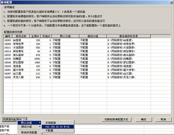 点击【列表游戏配置到】按钮,可将游戏随意配置到任意分组的本地盘或虚拟盘中。
