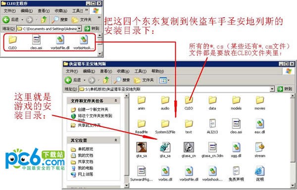 把这四个东东:CLEO文件夹、cleo.asi、vorbisFile.dll、vorbisHooked.dll放到游戏安装目录下,vorbisFile.dll会把原来的覆盖,记得备份哦!每一个CLEO补丁都是由cs文件来运行的,下面所要做的就是把你喜欢的*.cs补丁文件往CLEO文件夹里放,每个补丁都有各自的使用说明。